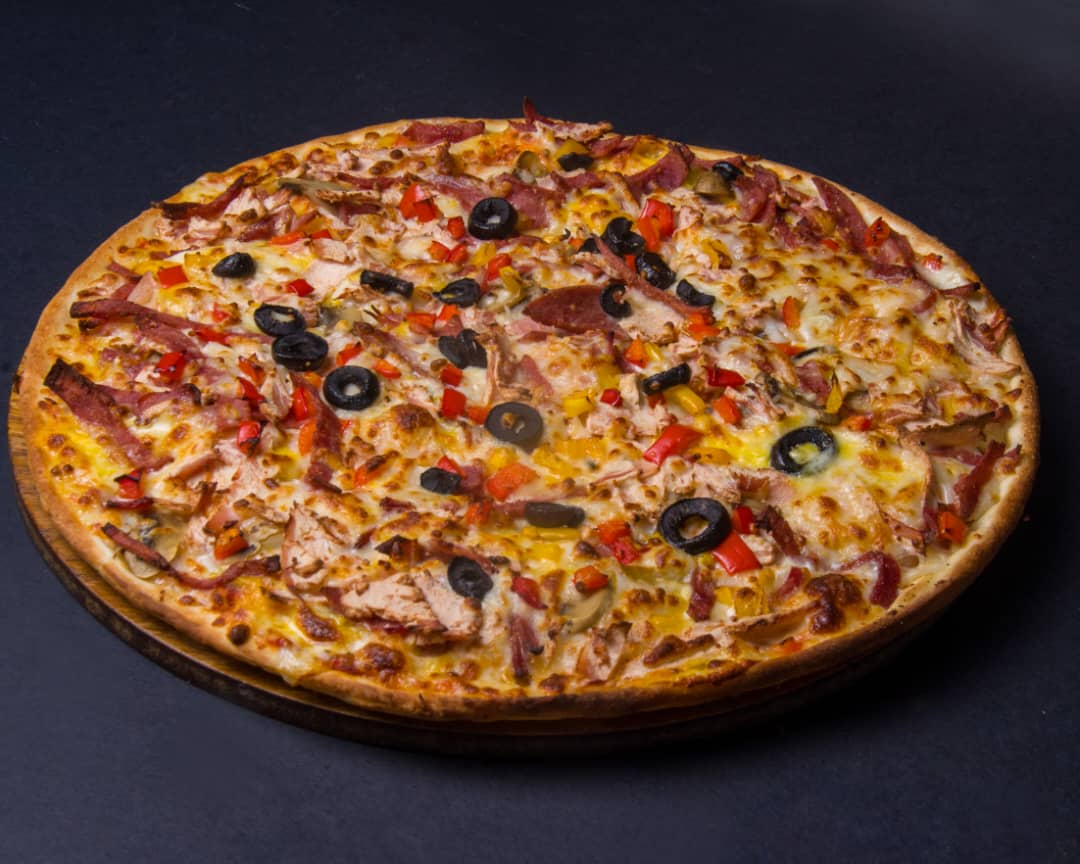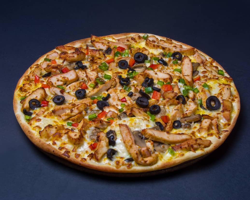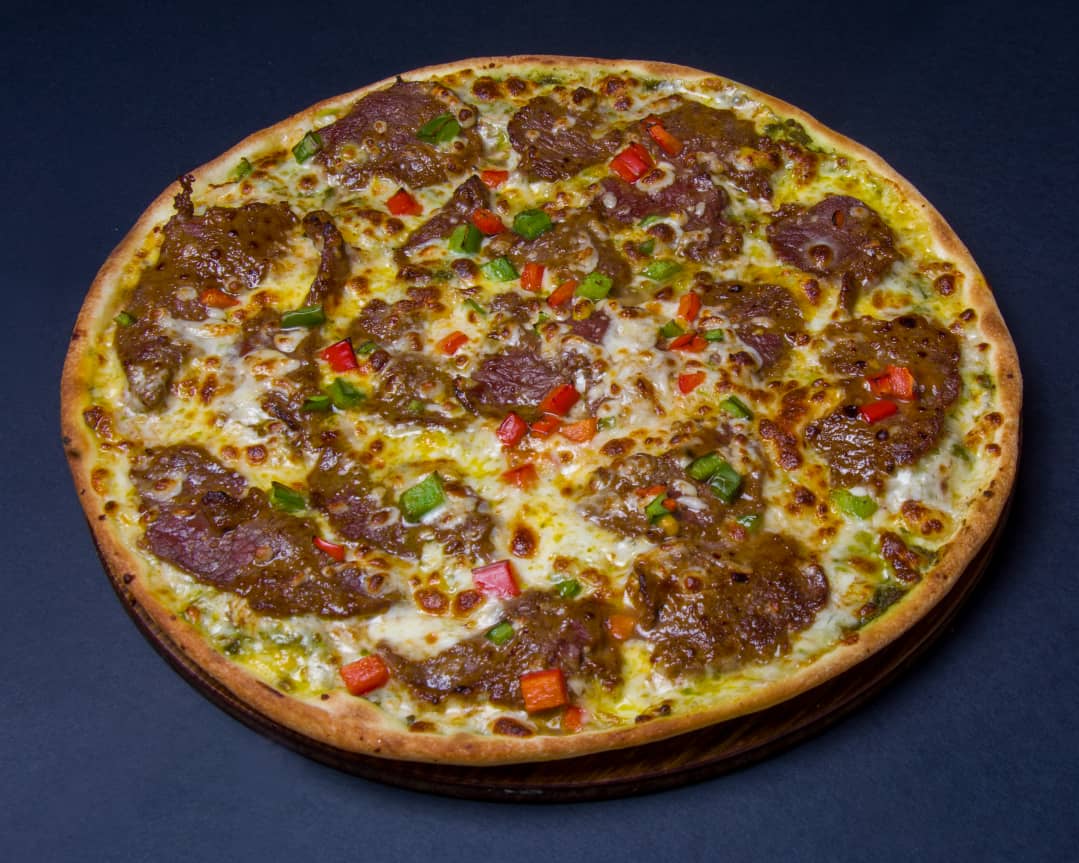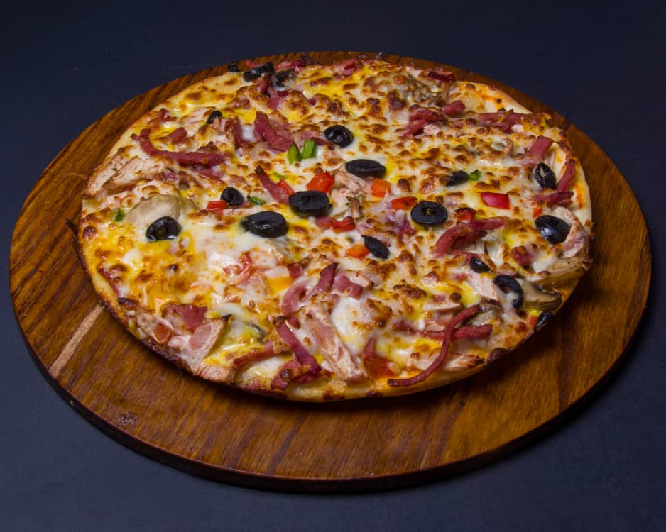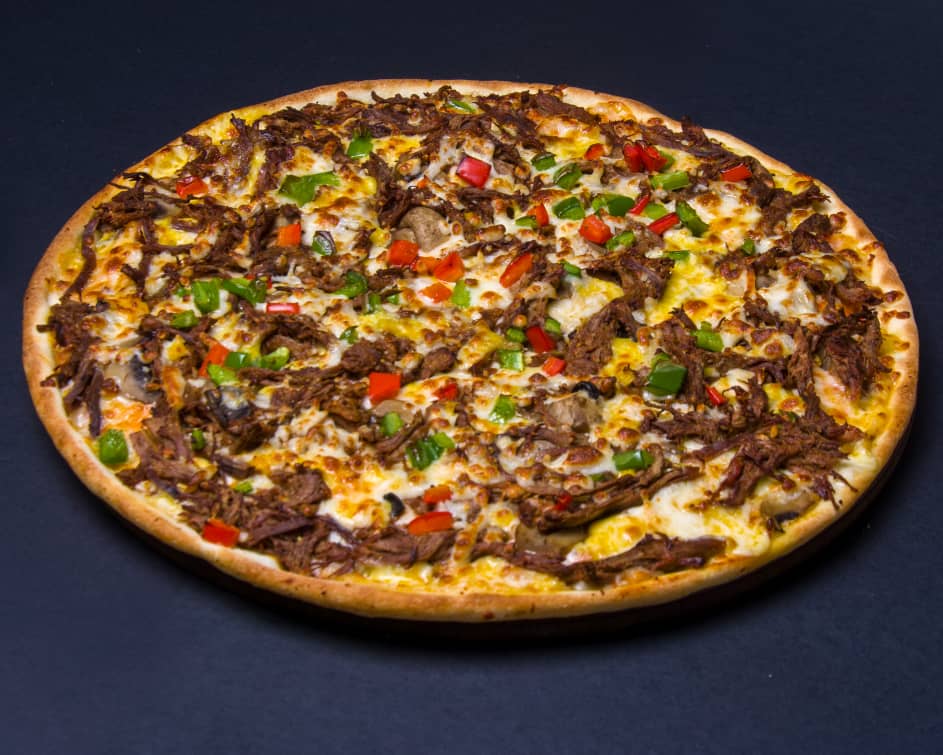 خمیر ایتالیایی-تکه های ورقه ای راسته گوساله-فیله مرغ-قارچ-دلمه رنگی-میکس پنیر-سس بینر(روی پیتزا)