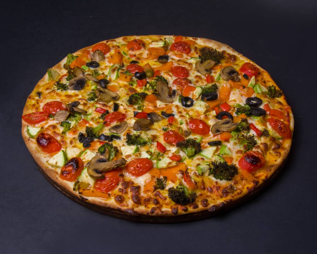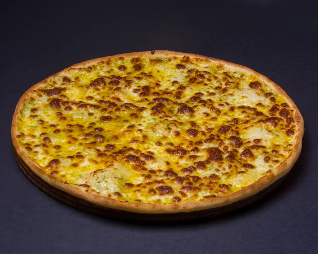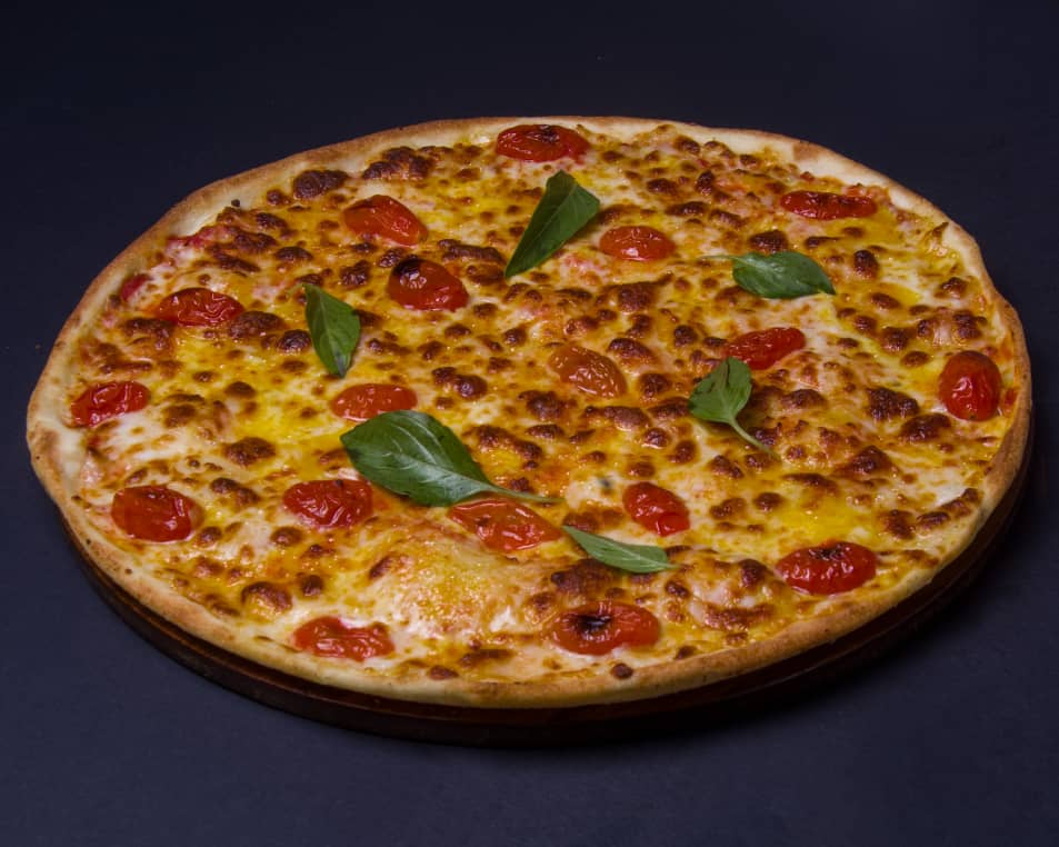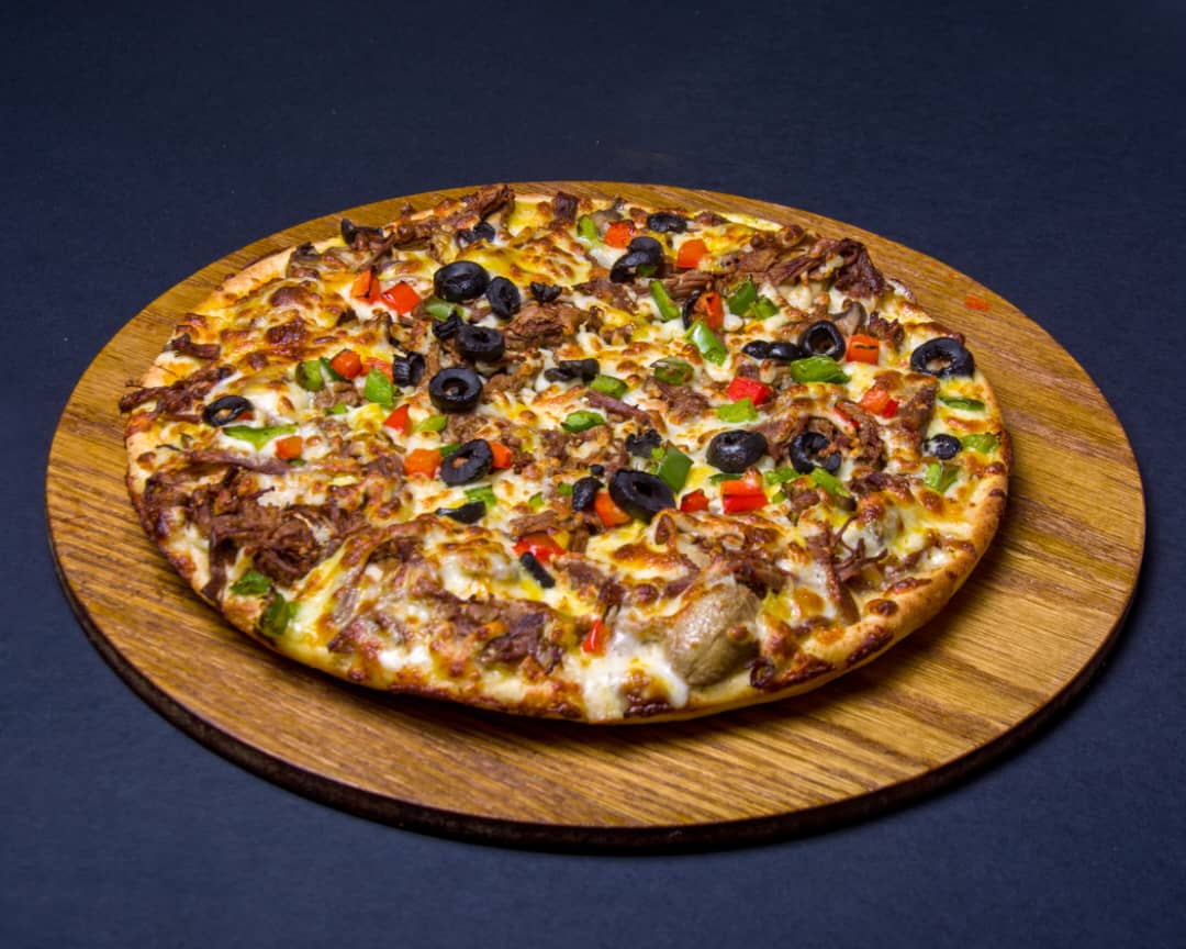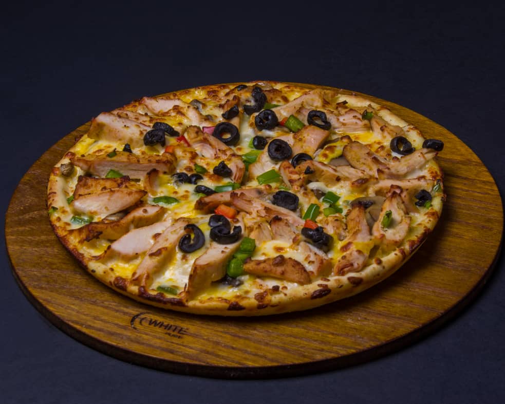 خمیر ایتالیایی-تکه های ورقه ای راسته گوساله-فیله مرغ-قارچ-دلمه رنگی-میکس پنیر-سس بینر(روی پیتزا)