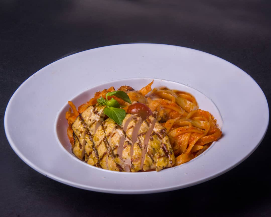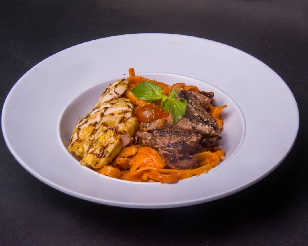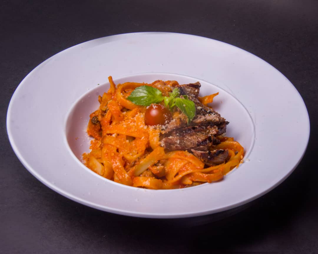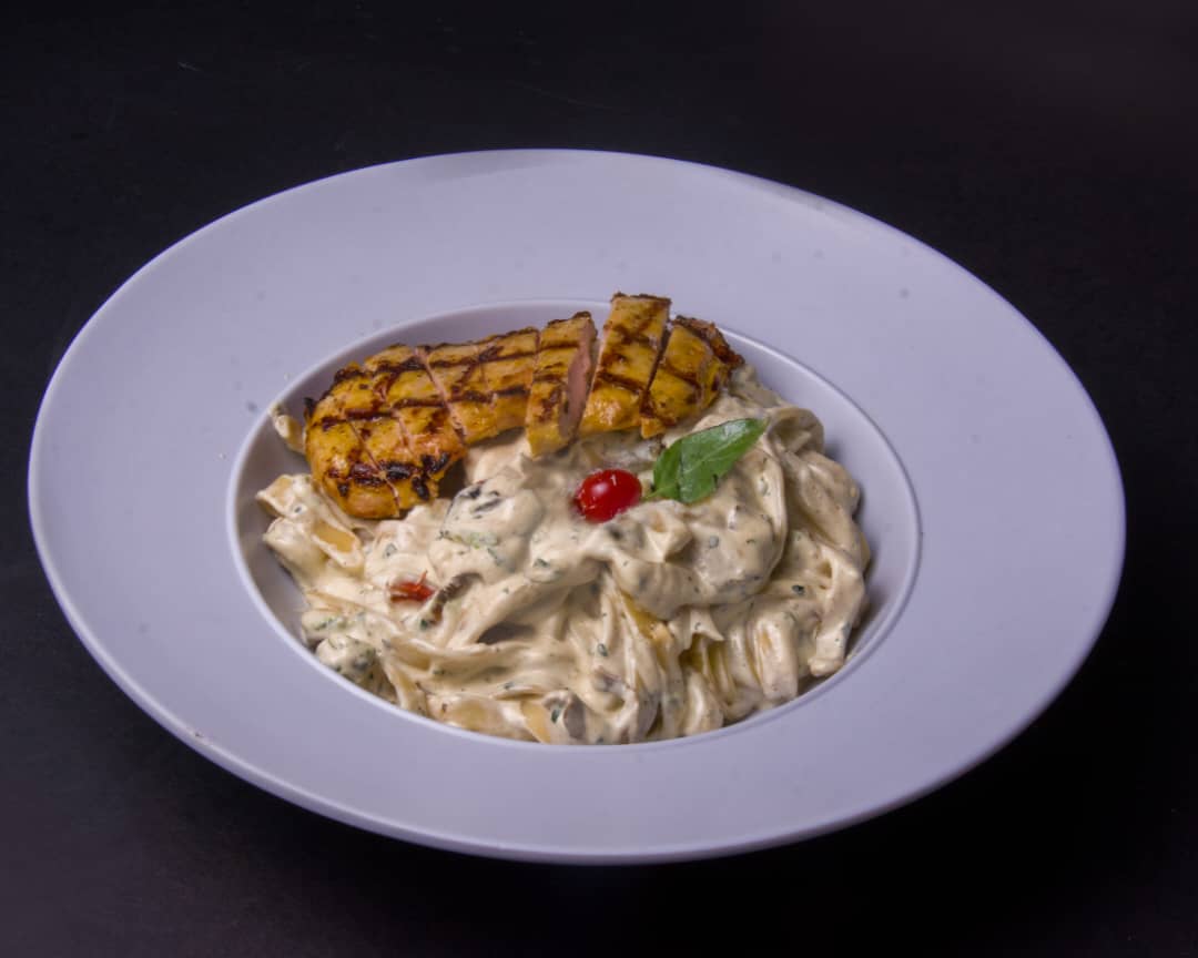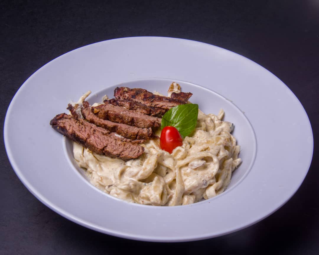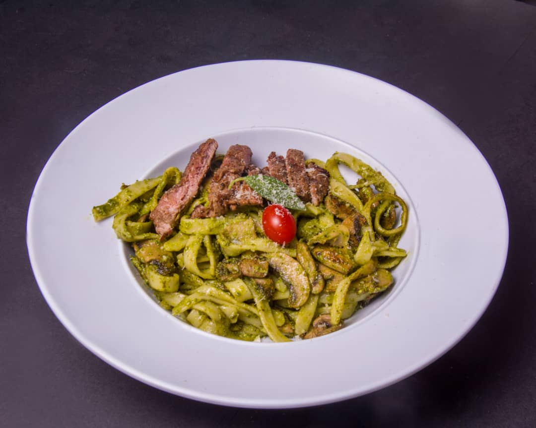 پاستا فتوچینی ، فیله گوساله ، قارچ ، سس آلفردو ، سس پستو ریحان ، پنیر پارمسان