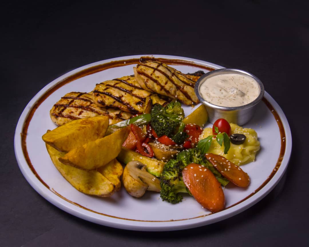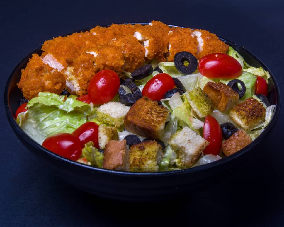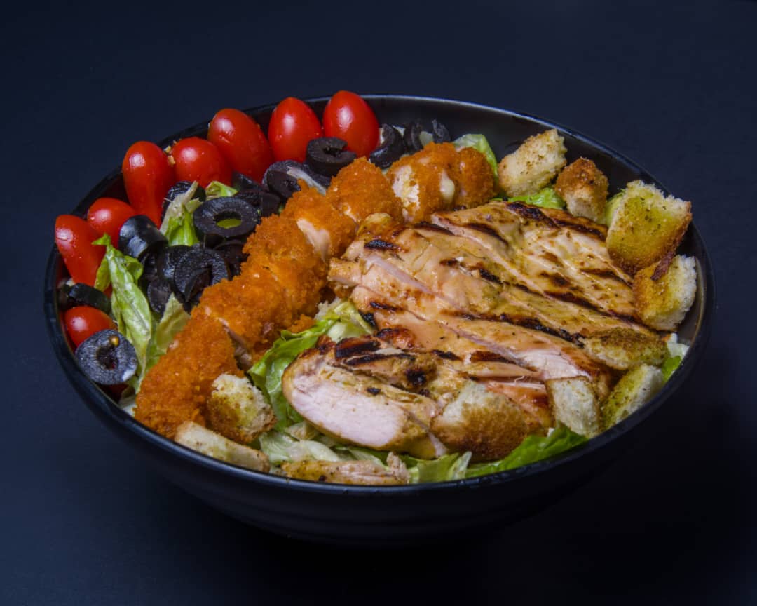 کاهو ، سینه مرغ شکم پر سوخاری ، سینه مرغ گریل ، نان تست ، گوجه ، زیتون ، پنیر پارمسان