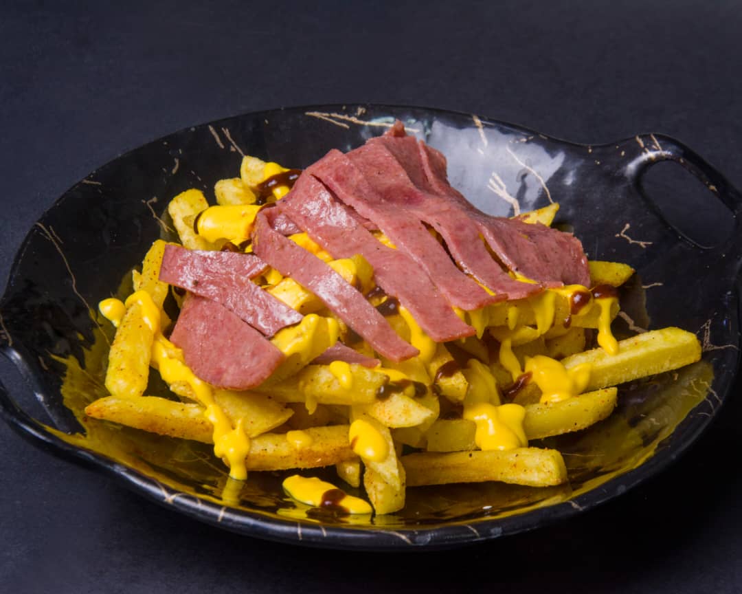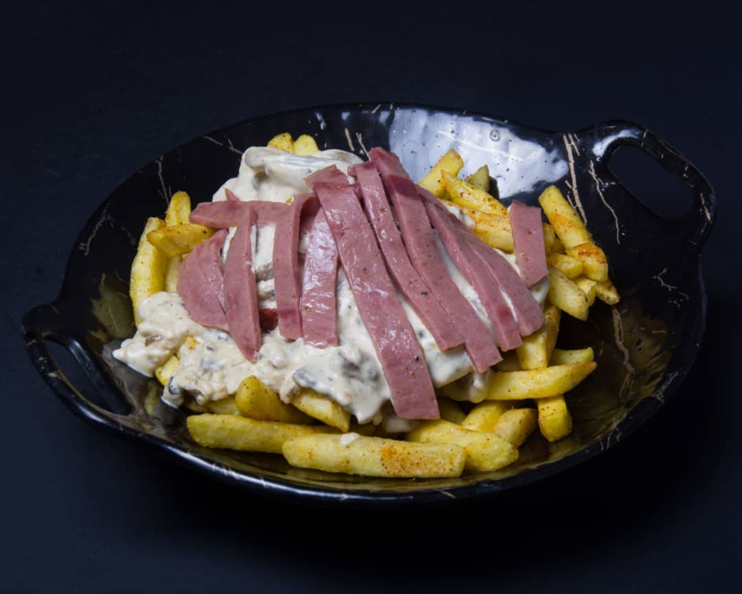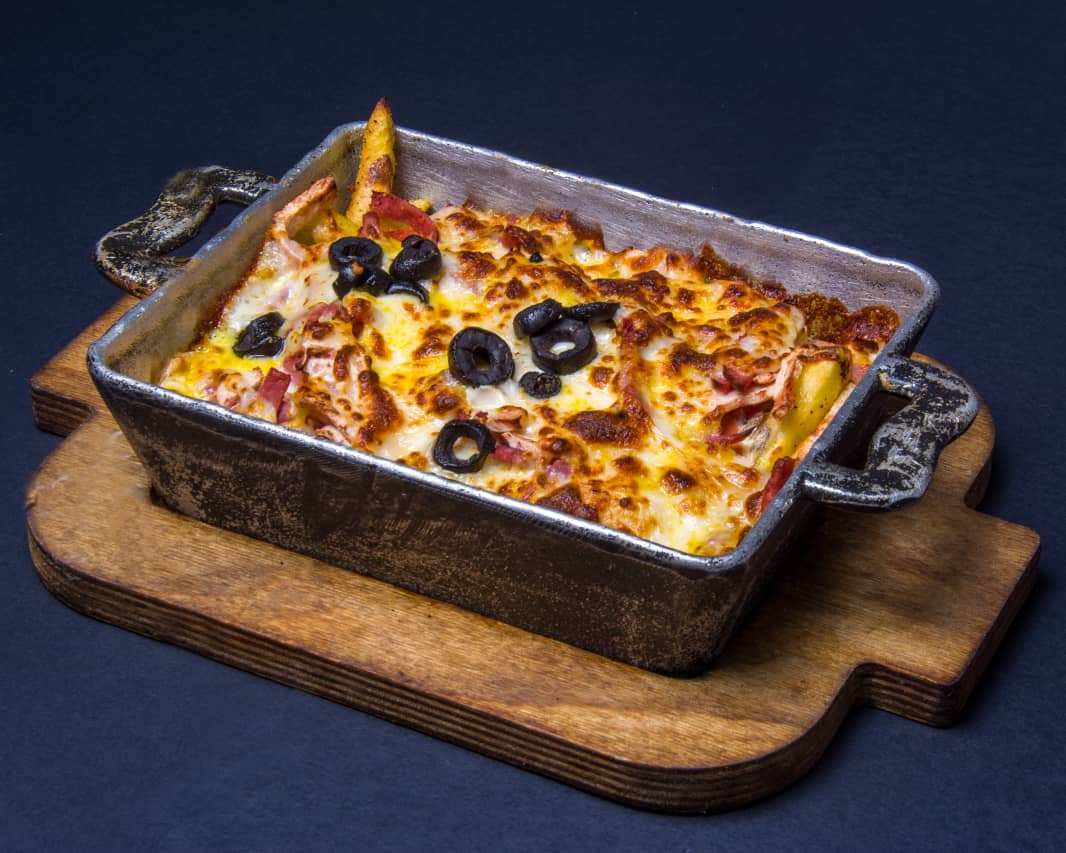 سیب زمینی سرخ شده با سس قارچ ، ژامبون ، پپرونی و میکس پنیر