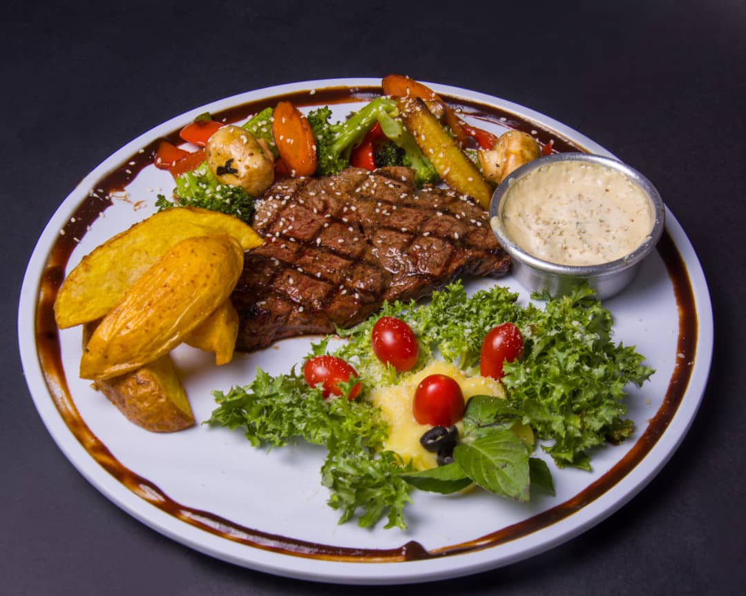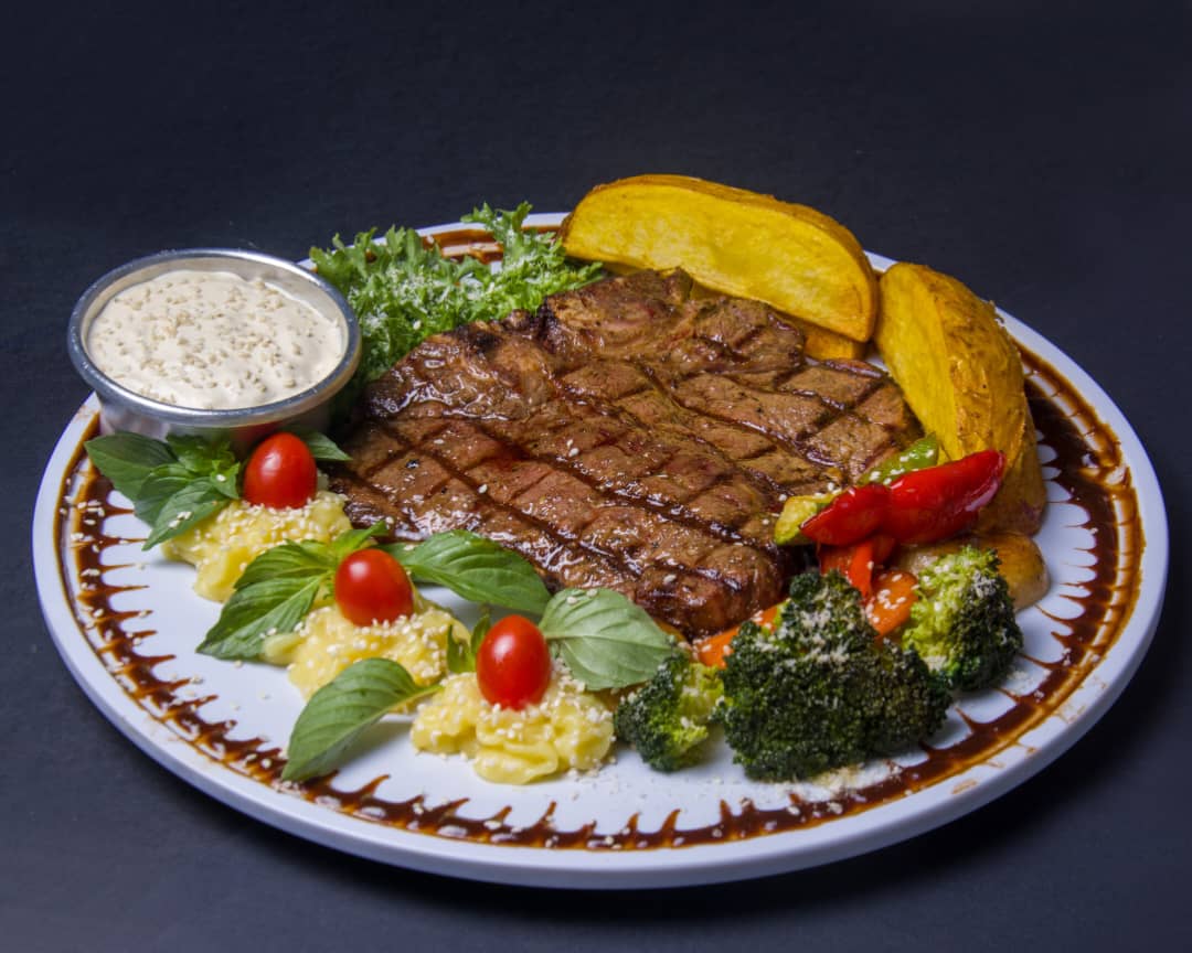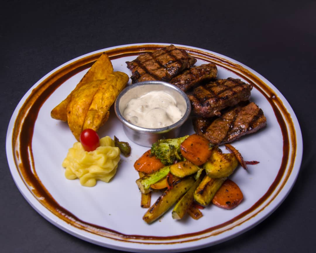 میکس فیله و راسته گوساله ، پوره سیب زمینی ، سس قارچ ، سبزیجات ، سیب زمینی