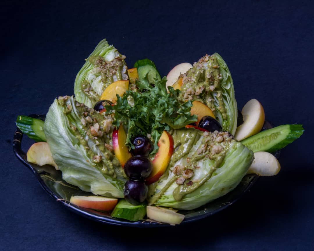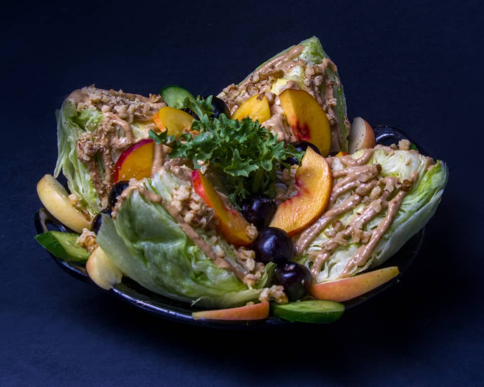 کاهو ، پنیر کبابی ، فیله گوساله ، گوجه فرنگی ، زیتون ، سس زرشک ، میوه فصل ، پنیر پارمسان ، پنیر کیپورز